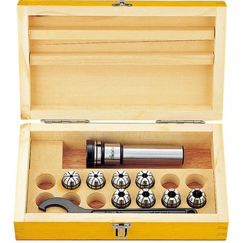 ストレートシャンク「ニュードリルミルチャック」と高精度ドリルミルコレットを頑丈な木箱にセットした経済的なチャックセットです。小型エンドミルによる加工や、金型の加工用として最適です。ミーリングチャック用チャック本体を組み込んだセットです。