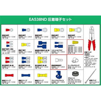 エスコ品番EA538NDセット内容絶縁丸端子(0.32mm2)×50個、絶縁丸端子(1.32mm2)×50個、絶縁丸端子(3.33mm2)×25個、絶縁差込型端子(1.32mm2)×50個、ソケット&プラグ(1.32mm2)×50個、コネクター(0.32mm2)×8個、コネクター(0.81mm2)×8個、コネクター(1.32mm2)×8個、コネクター(2.08mm2)×6個、コネクター(3.33mm2)×3個、結束バンド(178mm)×25本、圧着ペンチ(1.5・2.5・6mm2)×1本、絶縁丸端子(3.33mm2)×25個、絶縁Y端子(0.32mm2)×50個、絶縁Y端子(1.32mm2)×50個、絶縁Y端子(3.33mm2)×25個、差込型端子(0.32mm2)×100個、差込型端子(1.32mm2)×100個、差込型端子(3.33mm2)×50個、絶縁閉端接続子(0.32mm2)×50個、ケーブルクランプ(3.2・4.8・6.4mm)×25個、絶縁スリーブ(0.32mm2)×50個、絶縁スリーブ(1.32mm2)×50個、絶縁スリーブ(3.33mm2)×25個、クイックスプライス(0.81mm2)×15個、グロメット(3.2・4.8・6.4・7.9・9.5mm)×50個種別圧着端子セットケース寸法(mm)355×275×50内容量1個