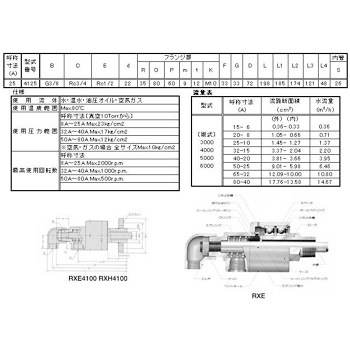REXタイプよりさらに高温・高速回転の仕様でシール部品にハイグレード材が使用されている給油タイプです。注記1: [水]は流路断面の(小)になる方で[蒸気]はローター内径断面(外側通路)で下記を原則に計算してあります。水の流速=3m/sec.注記2: 内管はいずれもガス管(SGP)寸法基準です。記号Rは1BPTおよびBSPオスネジです。記号RCは1BPTおよびBSPメスネジです。記号Gは1BPFネジです。 B:G1/4