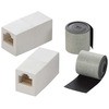 RJ45中継コネクタと簡易防水テープのセット品です。LD-VAPFシリーズの屋外対応LANケーブル(LD-VAPF/BK**)とアルミ強化フラットLANケーブル(LD-VAPF/SV05)を中継するのに最適な商品です。CAT5E対応のRJ45中継コネクタと簡易防水テープのセット品です。簡易防止テープはブチルゴム(自己融着)テープを採用しています。