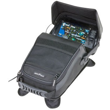 見やすい位置にフレキシブルに可動するナビ収納部!!専用シェードで日差しを遮り視認性が格段に向上。ナビゲーション収納位置をバッグ前方と上部のどちらにもフレキシブルに変更可能。コード類のまとめに大変便利な仕切りを内部に装備。ナビゲーションの出し入れがしやすい専用ポケット。ナビゲーションを使わない時は収納可能。専用レインカバー標準装備。
