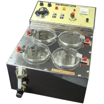 タンクに水を入れて温めるメッキ装置です。本体はオールステンレスでサビの心配もありません。ビーカーは4個セットできますので、面倒だった液の入れ替えもしなくてすみます。