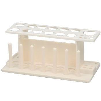 かき混ぜ棒等6本、試験管Φ22mm以下12本、試験管Φ30mm以下1本に対応する穴と、乾燥棒7本を装備したマルチ試験管立てです。