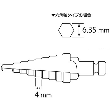 穴あけ、下穴拡大、修正・面取り、1本で様々な径に対応します。薄鉄板、木ねじの下穴、パイプなどの曲面など、様々な用途・材料に対応します。スパイラル溝の採用によりスクイ角が鋭角なため、従来品より大幅に切れ味が向上しました。刃には特殊加工および独自の研磨が施されていますので、作業時の抵抗が少なく、切れ味・切り粉の排出に優れています。ドリルは横滑りが少なく、被削材への食い付きが抜群で、センターポンチが不要です。