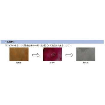 ニオイが気になりますが、水没箇所のステンレス製品のもらい錆び箇所に吹き付けたら、10分足らずで最初紫色に反応し、その後拭き取ったらきれいに取れました。完全防護(ゴム手、保護メガネ)にて作業されると良いでしょう。