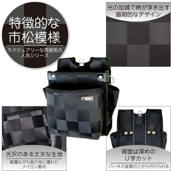 光沢のある艶やかな生地を使用し、こだわりの格子柄が目を引く高級感あるデザインの腰袋です。ナイロン生地を使用しており、軽量ながら頑丈です。独自の縫製技術を採用しており、強度と耐久性に優れています。底部に釘の頭が突き抜けないメッシュ式水抜き穴付きです。使いやすい標準サイズの左右ポケット付き腰袋2段タイプです。マチがゆったりした腰袋で収納力があります。