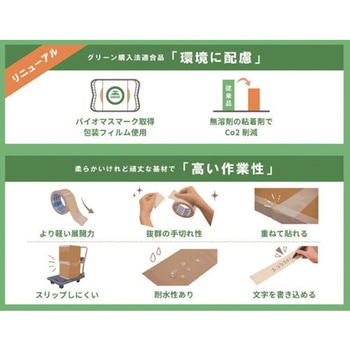 縦糸に再生PETを40%以上使用した環境配慮型のクロステープです。柔軟な基材のテープで手切れ性にも優れています。油性マジックで文字が書けます。