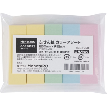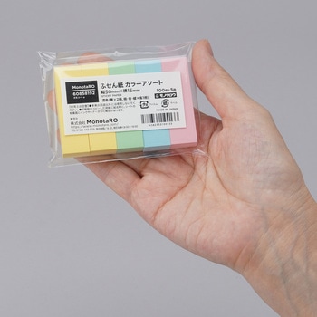50×15mmの付箋紙は案外小さいのですね。もっと大きいものがほしかったのですが,このサイズも多くの情報を記入しないのなら使い勝手はいいようです。多色なので目的別に使用できて助かっています。安価で良品です。