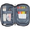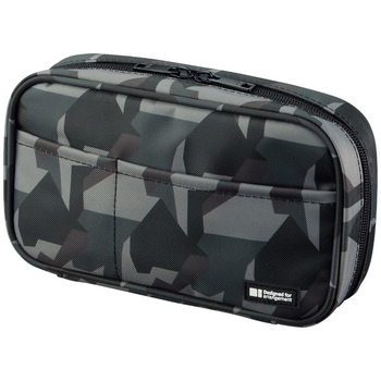 見開き式だから目的のペンがすぐ見つかります。消しゴムや替芯など小物収納に便利な小型3連メッシュポケット。ハサミやのりなど大型小物も収納できるメッシュポケット。カードとメモ(A7)が入る外側ポケット。