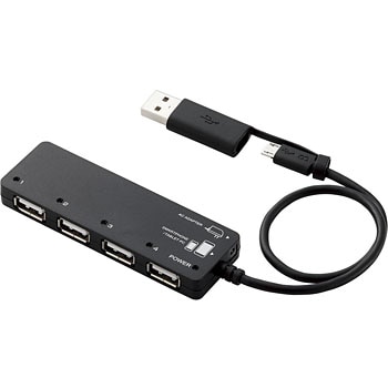 スマートフォン/タブレットPCでもパソコンでも、マウスやキーボードなどのUSB機器が使える!microBコネクタを搭載した、USB-A変換アダプタが付属したセルフパワー・バスパワー共用タイプの4ポートUSBハブ。
