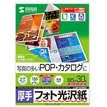 高級感のある超光沢仕上げのカラーレーザー専用紙です。写真画像も文字も鮮明な印字を実現します。 0.185mmとコシのあるしっかりとした厚みです。 両面に印刷できるので、写真を使ったPOP・カタログに最適です。※裏面はつやなしマットタイプです。<カラーレーザープリンタ専用設計だからココが安心> トナーの転写率が良好で常に安定した印字が得られます。 用紙間の摩擦係数を低減させており、重送や空送など給紙ミスの起こりにくい安心設計です。 一般紙で出やすい画像部分の光沢ムラや光沢低下、画像部分の膨れや爪あとのようなキズができにくくなっています。