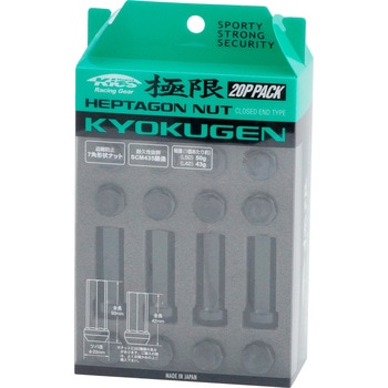 商品は7角形ヘプタゴンナット、ツバ径Φ20mm小径袋ナット(専用アダプター外径Φ24mm)となります。全長42mmと50mmの2タイプ、材料クロモリ(SCM435鍛造)材を使用しています。