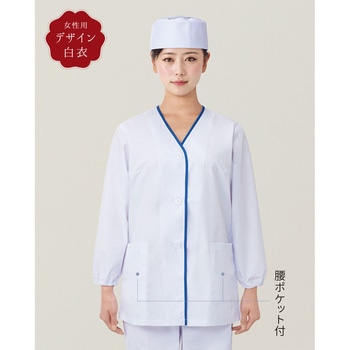厨房や給食センターなど、衛生管理にこだわる現場に最適な、衿なしの女性用調理白衣です。洗濯を繰り返しても抗菌効果が持続する『フレッシュエリアR』シリーズで、衛生的な状態をキープ。袖口はゴム入りで、異物混入を防ぎながら水仕事にも対応しやすい仕様です。両腰ポケット付きで、ちょっとした小物の収納にも便利です。