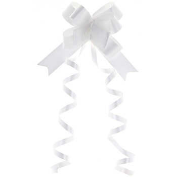ワンタッチで美しいボウができあがります。中央の2本のたれをカーリングさせて、華やかに仕上げましょう。完成サイズ:約60×80mm