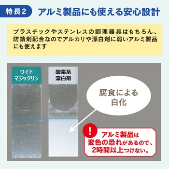 ●食器・調理器具やフライヤー槽内、レンジの受け皿や五徳、換気扇など幅広く使え、防錆剤配合でアルミ製品にも使えます。