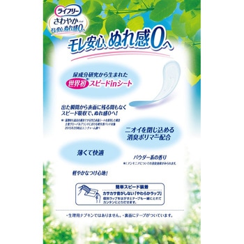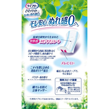<ナプキン型尿ケアパッド>ぬれ感ゼロの吸収力へ●出た瞬間から表面に残る間もなくぬれ感ゼロへ。●尿成分研究から生まれた世界初※1スピードinシート。●ズレにくさUP。幅広ズレ止めテープで、モレ安心。●ニオイを閉じ込める消臭ポリマー※2配合。パウダー系の香り。●横モレを防ぐ立体ギャザー。<以下注釈>※1湿潤時も嵩高を維持できる凹凸表面シートを採用した構造。主要グローバルブランドにおける軽失禁パッド対象 2015年2月ユニ・チャーム調べ。※2アンモニアについての消臭効果がみられます