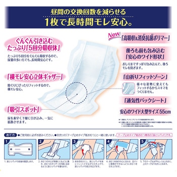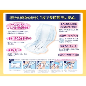 全面通気搭載で1枚で長時間あんしんな尿とりパッド●たっぷり「4回分吸収体」が、ぐんぐん吸収するので尿量の多い方でも、長時間安心。●全面通気シート搭載でムレずに安心。●「山折りフィットゾーン」が様々な姿勢においてもフィットするからスキマをつくらない。●「横モレ安心立体ギャザー」が体にフィットし横モレを防ぐ。●後ろも前も包み込む安心のワイド形状。●安心の大型サイズ55cm。