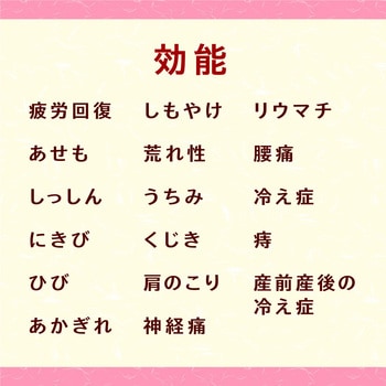 疲労回復、あせも、しっしん、にきび、ひび、あかぎれ、しもやけ、荒れ性、うちみ、くじき、肩のこり、神経痛、リウマチ、腰痛、冷え症、痔、産前産後の冷え症