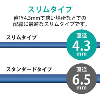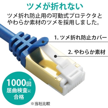 プロテクタと新素材コネクタ採用のダブル構造で、通常の使用環境では絶対にツメが折れない!※10G BASE-Tに対応し、直径わずか4.3mmで狭い場所などでの配線に最適なスリムタイプのLANケーブル。※1000回の屈曲検査に合格(メーカー検証)