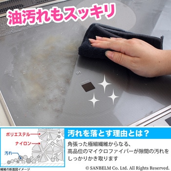 マイクロファイバーが汚れをしっかりかき取り、油汚れもきれいに落とします。電子レンジやIHコンロに最適です。