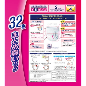「スルッとはける」介助があれば歩ける方のための、うす型で長時間モレずに安心な紙パンツ●軽い力でサッと広がりはきやすい。●特許技術「股下すっきり設計」※1で身体とのすきまをつくらずぴったり安心。●特許技術 ご本人でも破りやすい「らくらくステッチ」※2。両脇を破って、サッと脱げる。●特許技術 背中・足ぐりにふんわりフィットする「背中・足ぐりピタッとギャザー」がすきまモレを低減。●背モレブロック構造。尿・軟便をせきとめる空間が背モレを防ぐ。●特許技術 ギャザー間が広い「パッドすっぽりギャザー」でパッド交換が簡単。●特許技術 おしりに引っかからない「スルッとゾーン」がウエストゴムの巻き込みを防止。●特許技術 「足入れスムーズ」によりすっきり形状で足の指がひっかからない。●「やわらかストレッチゾーン」が軽い力で2倍に広がる。●「しっかりフィットゾーン」がズレを防ぐ。●「うす型パワフル&ロング吸収体」でたっぷり4回吸収。●スッキリうす型で、ゴワゴワしない。●全面通気シートで、ムレずにサラサラ。●下着のような肌触り。●パワー消臭トリプル効果※3。<以下注釈>※1股下の吸収体括れ部の前後とその前側にある変形誘導部により、股下部とその前側を股間の凹部から脚繰りに沿って肌側に凸に変形しやすくする吸収体構造。※2係止部の剥離強度が製品横方向に比べて縦方向が弱い、サイドシール構造。※3アンモニア・ジメチルアミン・インドールについての消臭効果があります。おしっこ約4回分(約600cc)を吸収します。医療費控除対象品
