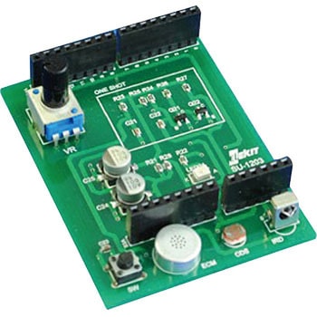 実際の部品の動作を確認しながら、電子部品の特徴や使い方を効率的に学習できる製品です。動作の制御にはArduinoを使用し、プログラムを使って電子部品を使用するときのポイントが体験できるようになっています。電子部品にボリューム、プッシュスイッチ、音センサー、光センサー(Cds)、赤外線センサーがセットされています。