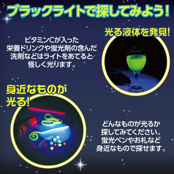 ブラックライトがついたペンです。白い紙にマジカルライトペンで絵や秘密のメッセージを描きます。そのままでは何も見えませんが、ペンの先についたブラックライトで照らすと、書いた絵やメッセージが光って見えます。