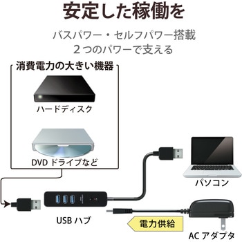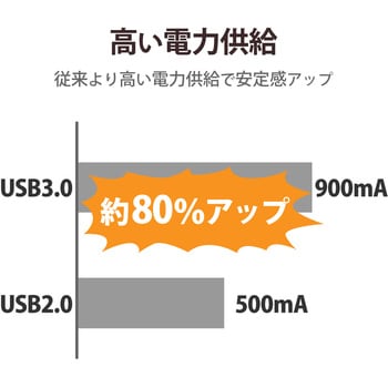 付属のACアダプタを接続してセルフパワーモードで使用することで、消費電力の大きなポータブルハードディスクドライブなどを使用する際にも、安定した電源供給が可能です。