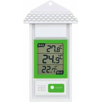 数種類のデジタル温度計を購入・比較しましたが、こちらは最高、最低気温が一目で分かる点が気に入り、新設ハウス用に再購入しました。文字も大きくコントラストもはっきりしていて見やすく、また上部の穴がある点も設置場所を選ばす吊り下げて使用できるため、重宝しています。時計機能がない点が残念ですが、温度優先で選びました。この色も気に入っていますが、色のバリエーションがあったらもっとよかったかなと思います。