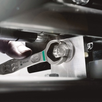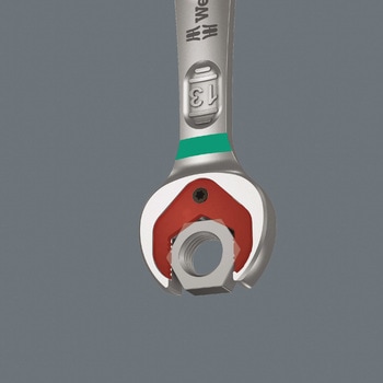 スパナ部分の特殊なプレート構造により、ナットやボルトが落ちることがないため、スパナでボルトをはさんだまま横向きで狭い箇所に挿入したり、上から力を入れて押さえながら、強いトルクでボルトを回すことができます。スパナ部分の「ダブルヘックス」構造は、通常のスパナではまわすことができない、なめたり、サビたボルトをまわすことができます。ギア部分は80枚でスムーズな動きを可能にしています。30°の小刻みなリターンアングルを実現しています。