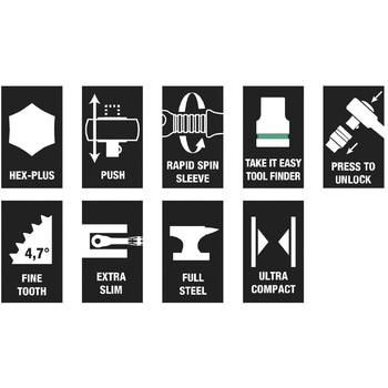 テキスタイルボックス収納仕様で従来のメタルケースに比べて軽く、また折りたたみ式のためスペースをとりません。差込角をワンプッシュで反対方向に押し出すことで、正逆回転の変更が可能です。独自機構により、差込角が飛び出して落ちてしまうことがなく、安全です。ソケット脱落防止機構付です。ヘッド部の厚みは非常にスリムで狭い箇所での作業性にも優れています。非常に頑強なつくりです。