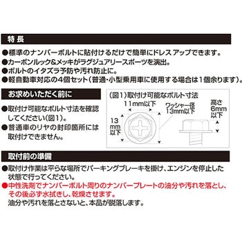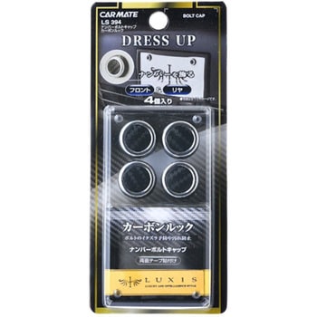 カーボンルック ナンバーボルトキャップ標準のナンバーボルトに貼付けるだけで簡単にドレスアップできますカーボンルック&メッキがラグジュアリースポーツを演出ボルトのイタズラ予防や汚れ防止に軽自動車対応の4個セット(普通・小型乗用車に使用する場合は1個余ります)。