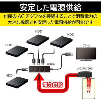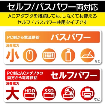 付属のACアダプタを接続してセルフパワーモードで使用することで、消費電力の大きなポータブルハードディスクドライブなどを使用する際にも、安定した電源供給が可能です。