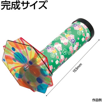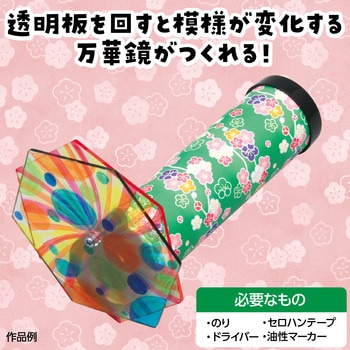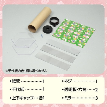 自分で描いた絵が、万華鏡の美しい模様になる透明板に絵を描いて回すと模様が変化する万華鏡です。オリジナルの万華鏡がつくれます。プラスチックキャップに差し込むだけなので、組み立ても簡単です。材質:紙、PP、ポリ塩化ビニル。サイズ:完成サイズ:Φ100×153mm、紙管:Φ39×140mm、ミラー:31×140mm、千代紙:140×125mm、透明板・六角:100×100×2mm。セット内容:紙管×1、ミラー×3、キャップ×各1、千代紙×1、ネジ×1、透明板・六角×2
