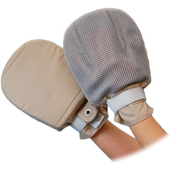 2層構造のパッドにより物が掴みにくくなっています。手首ベルトの上からアイデアホック付きのストッパーをかぶせて留めるため、使用者本人ではミトンを外しにくい構造です。手の甲側のメッシュと2層構造のパッドは通気性が高く、ムレにくくなっています。