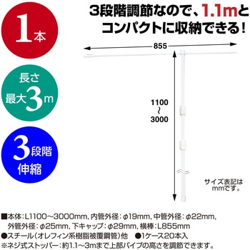 2つのネジ式ストッパーで長さを3段階調節できます。最大3mまで伸縮可能!パイプ収納時は1.1mとコンパクトに保管できます。