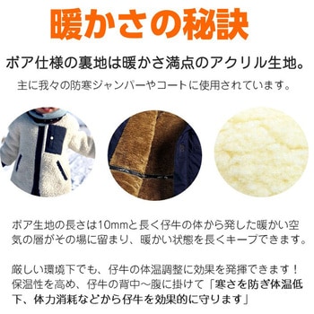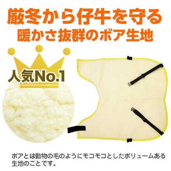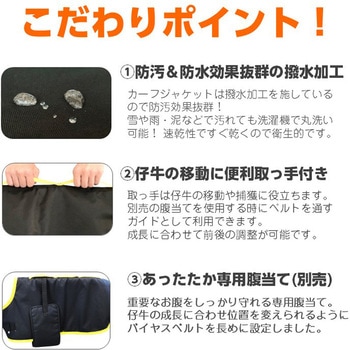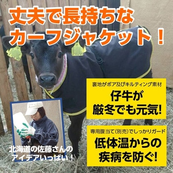 北海道で仔牛に携わる農家の方とこだわって作ったカーフジャケットです。仔牛は皮下脂肪が少なく、第一胃も発達していないため、十分な防寒保温対策が必要です。カーフジャケットを着用することにより、生後1ヶ月前後の仔牛の低体温症を防ぎ、常に良いコンディションで管理することができます。裏面ボア付きのジャケットを着用することで、仔牛を暖め、伝染病(皮膚病など)予防、体温管理、下痢止め等に効果があります。厳冬から仔牛を守る、裏地ボア。防汚効果抜群の撥水加工済み生地。成長に合わせて位置調整可能。