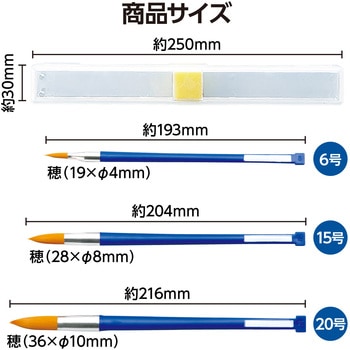 材質:PP,ナイロン。サイズ:小6号:穂(19×径4mm)・全長(193mm)、大15号:穂(28×径8mm)・全長(204mm)、特大20号:穂(36×径10mm)・全長(216mm)。セット内容:アクア水彩ナイロン筆 小6号×1本(穂:19×径4mm、全長193mm)、アクア水彩ナイロン筆 大15号×1本(穂:28×径8mm、全長204mm)、アクア水彩ナイロン筆 特大20号×1本(穂:36×径10mm、全長216mm)、画筆箱小×1(250×30×20mm)