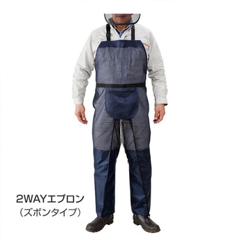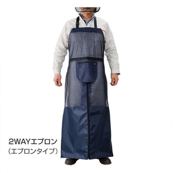 エプロン(前掛け)形状とサロペット(ズボン)形状の2WAYタイプファスナーの付け替えでお好みに応じて2WAYの使用が可能。水気がかかりやすい足回りは防水生地、上部は通気性に優れたメッシュ生地を採用。