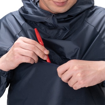 紐による調節可能なフードと胸の真ん中に便利なファスナー付きポケットが付いています。