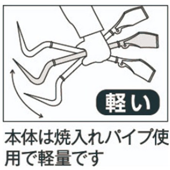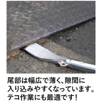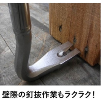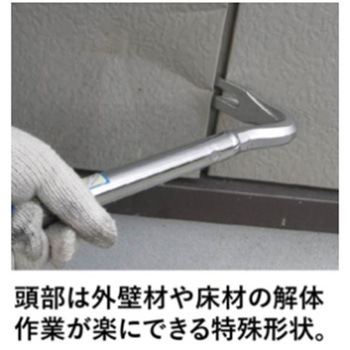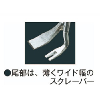 軽くて丈夫な為、長時間の作業にも適しています。熱処理をした特殊鋼パイプを使用しています。頭部はハンマーで叩きやすい形状になっており、ハガシ作業で壁際の隙間などにハンマーで頭部を叩き込んで使用できます。また、鶴のような特徴的な形をしており、より軽い力でハガシ作業が行えます。尾部は幅広で薄く、すき間に食い込みます。サビに強いクロムメッキ仕上げ。高所作業の安全ロープ用穴付き。