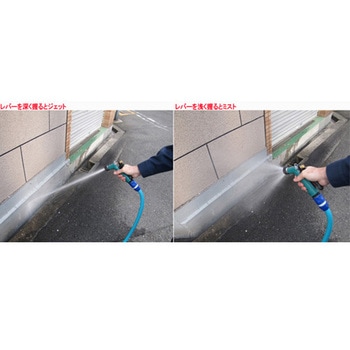 水量調整により直射噴霧が可能。ステンレス製バネ付き。噴射部分のねじ山を保護するラバーヘッド付き。別売のノズルを取り付けられるねじ山つき真鍮製ノズル。温水も使用可。継続噴射用の固定クリップつき。スプレーパターン2種(ジェット、ミスト)。