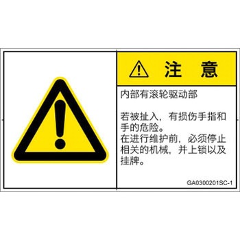 | 52280278 | GA0312803SC-1 | 1シート(16枚) | ロール部に指を引き込まれる恐れあり。 運転中はロール部に手を近づけないこと。 保守作業は電源を切ってから行うこと。 | 70×42 | 対象業界: 食品機械、対象者: 保守要員 | | |