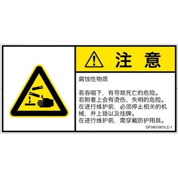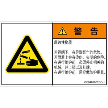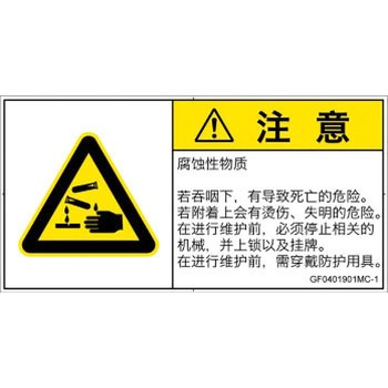 | 52286386 | GF0401902MC-1 | 1シート(10枚) | 腐食性物質 飲み込むと死亡の恐れあり。 付着するとやけど・失明の恐れあり。 保守前に、該当する機械を停止し、ロックアウトおよびタグアウトすること。 保守前に、保護具着用。 | 92×47 | 対象業界: 一般機械、半導体、対象者: 保守要員 | | | |
