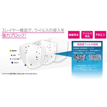 医療現場での感染予防に。立体形状で顔にピッタリフィット。耳部分は伸縮性素材で耳が痛くなりにくい。高密度フィルター採用で、花粉ウィルス等の侵入を防ぐ。PM2.5対応。フィルター捕集効果99%(カケンテストセンター)。1枚あたりがお得な大容量の立体マスク。レギュラーサイズ。マスクサイズ95×140mm。