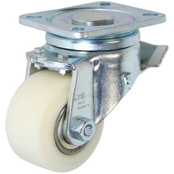 自在旋回部分に特殊強化構造を用い、大きな衝撃や長期の負荷にも耐えられます。車輪は耐摩耗性・高弾性の高分子キャストナイロン素材を使用しています。車輪には密封型ラジアルボールベアリングを使用しているので、グリースの追加注入がなくとも静かで滑らかな回転です。ストッパーはキャスターの進行方向前方に設置自在旋回・固定が同じ取付ピッチです。