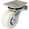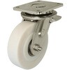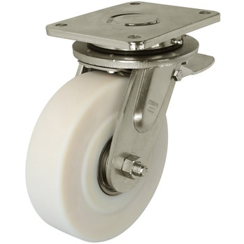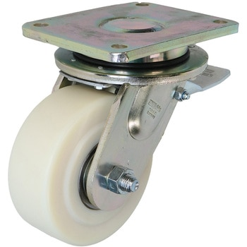 自在旋回部分に特殊強化構造を用い、大きな衝撃や長期の負荷にも耐えられます。自在旋回部にはスラストベアリングとテーパーローラーベアリングを装備。車輪は耐摩耗性・高弾性の高分子キャストナイロン素材を使用車輪には密封型ラジアルボールベアリングを使用―グリースの追加注入なしでも静かで滑らかな回転ストッパーはキャスターの進行方向前方に設置自在・固定が同じ取付ピッチ