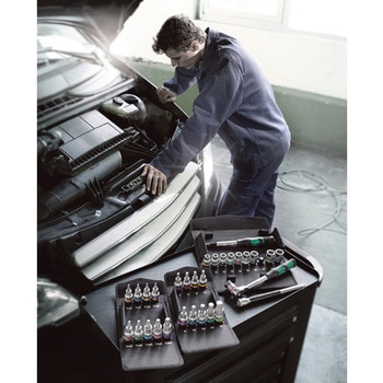 ソケットは色別でサイズを見分けられるようになっています。差込角をワンプッシュで反対方向に押し出すことで、正逆回転の変更が可能です。独自機構により、差込角が飛び出して落ちてしまうことがなく、安全です。ソケット脱落防止機構付です。ヘッド部の厚みは非常にスリムで狭い箇所での作業性にも優れています。製品は軽く、少ない負担で作業できます。非常に頑強なつくりです。
