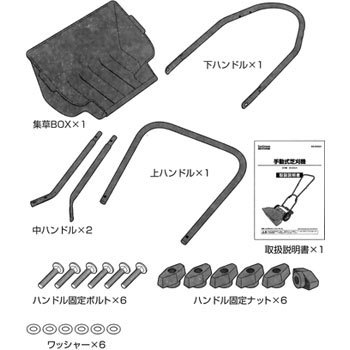集草ボックス×1、下ハンドル×1、中ハンドル×2、上ハンドル×1、ハンドル固定ボルト×6、ハンドル固定ナット×6、ワッシャー×6、取扱説明書×1
