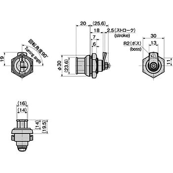 つまみ易い形状の為、取手としても使用することができます。施開錠が一目で認識できるように、マークスプリングが締付け方向に働き、扉のガタつきを抑えます。難燃材(UL94V-0)を使用。マイナスドライバーで施開錠できる簡易ロック付。インジケーター付でロック時の確認が容易に行えます。